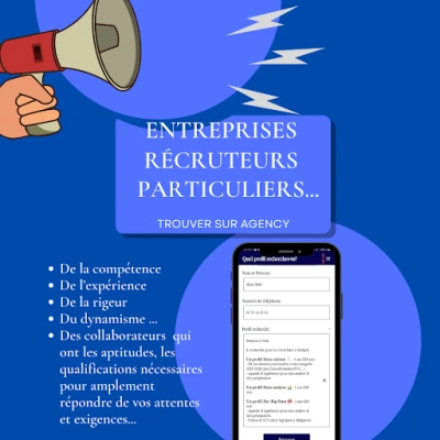 ✅Tu es une entreprise, un recruteur ou un particulier, Agency te trouve les meilleurs profils. Tu recherche une compétence particulière? un service de qualité ? Fini la perte de temps sur les CV, entretiens, post...