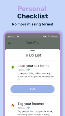 BossTax App tracks your business expenses for free. Then upload your tax forms and sit back while your team professionally prepares your tax return. Federal, state, and local U.S. tax returns completed and filed - all right from your phone. No printer required! Pay for tax prep only when you decide to file. Here's how it works:
