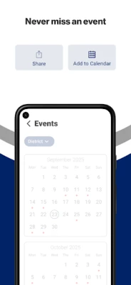 NEVER MISS AN EVENT The event section shows a list of events throughout the district. Users can add an event to their calendar to share the event with friends and family with one tap.