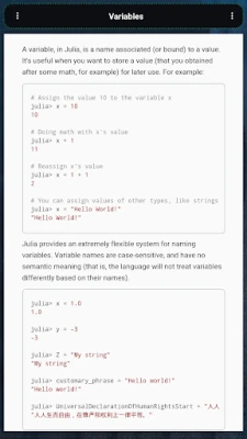 Greetings. This is a beautiful app that will allow you to learn Julia Programming Language from start to finish completely offline. Learn while on an airplane or without internet access, for free. Julia is a high-level, general-purpose dynamic programming language. Its features are well suited for numerical analysis and computational science