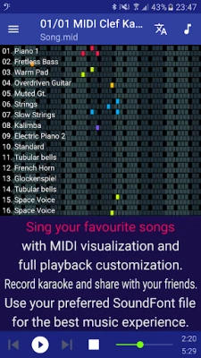 MIDI Clef transforms your phone or tablet into a full-featured music workstation. Play any MIDI, MOD tracker or CDG (MP3+G) file, view synchronized lyrics and chords, plug in an external keyboard, apply pro-grade effects and capture your own karaoke covers