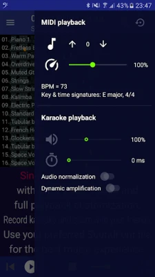 • Modify the MIDI playback: transpose, adjust tempo, change instruments, set pan, chorus and reverb