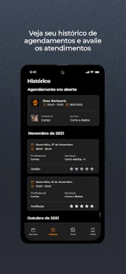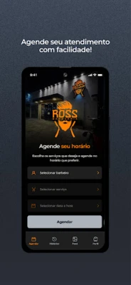 Através do App Ross Barbearia os clientes podem realizar seus agendamentos de uma forma muito mais prática. Na tela inicial, é possível selecionar os serviços e horário desejado para seu próximo atendimento. Já na tela de histórico, você poderá avaliar como foi o seu atendimento, remarcar ou cancelar seus agendamentos. É possível também na tela do perfil o cliente editar suas informações, como e-mail, foto de perfil e telefone.